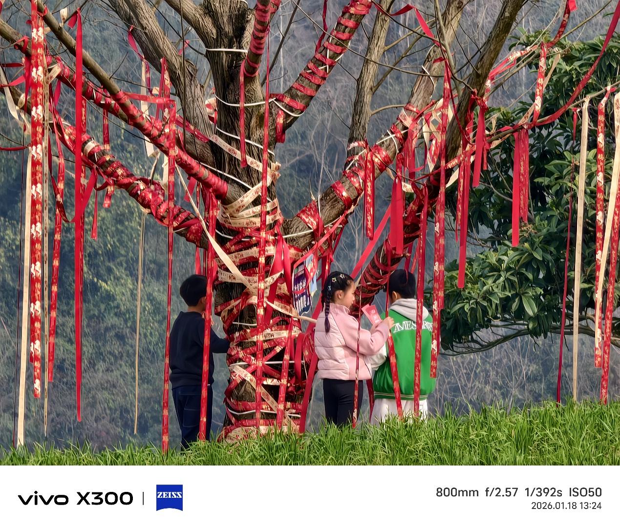 山野间挂满丝带的枯树,树枝的轮廓分明,丝带色彩和图案清晰,小朋友衣服的折皱和颜色还原到位,近景草地的色彩和状态真实自然。