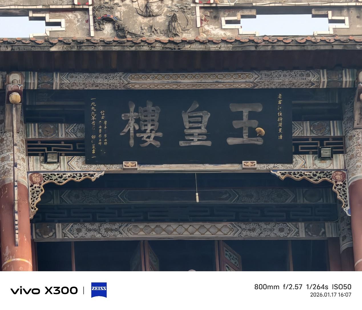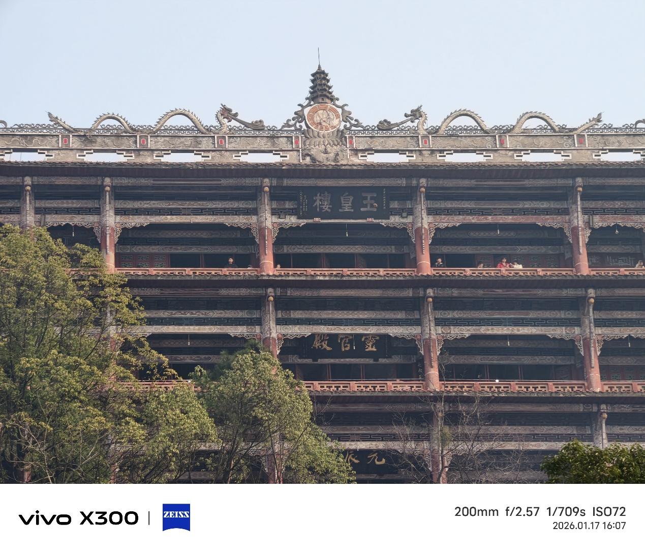 拍道观阁楼,200mm、400mm和800mm拍出的照片,建筑物的各种细节都很清晰,楼顶的龙雕、莲花宝座,屋檐上错落的红瓦以及房梁上各种手绘的图案都近在眼前,色彩也基本保持一致,1600mm通过算法拍出的照片色彩和清晰度有下降,但用这么长的焦距拍摄一般主要是为了拍清被摄主体,色彩要求可以退而求其次。