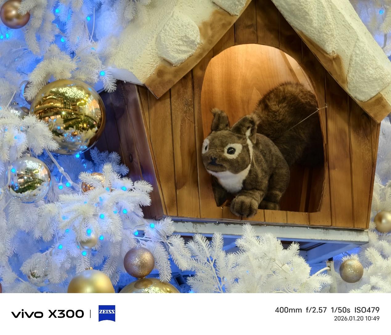 木屋里的松鼠憨态可掬,能从毛绒绒的材质上感受到柔软的触感,能看清旁边一根根被白雪覆盖的圣诞树枝条。