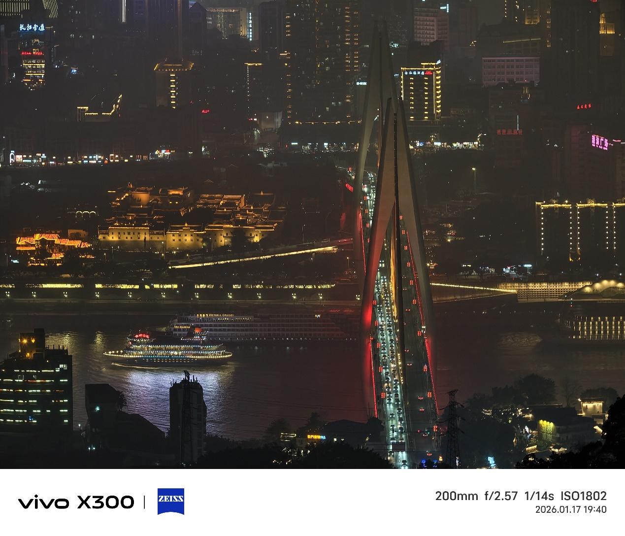 夜景方面,它也能拍出稳定出彩的照片。远景中江对岸高楼外墙的灯饰、中景桥梁和穿行车辆以及江面行驶的游轮的轮廓都清晰可见,不同颜色的灯光真实,没有眩光。