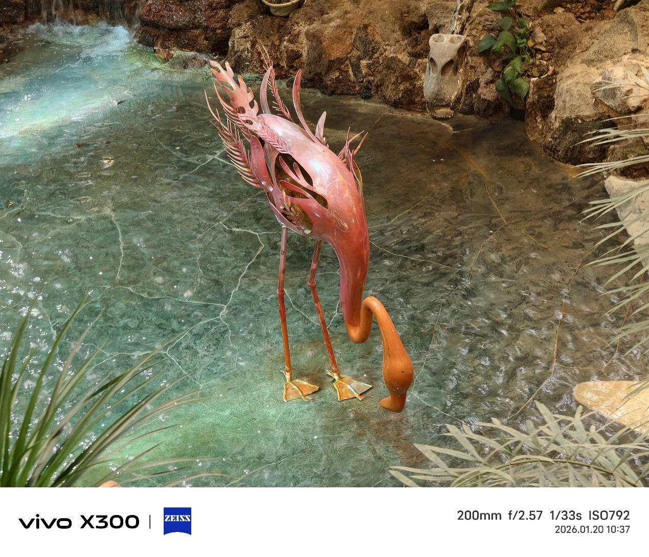 从二楼拍的火烈鸟模型,不仅能看清羽毛的形状,还能通过光影分辨出这是一个由金属材质做成的模型。