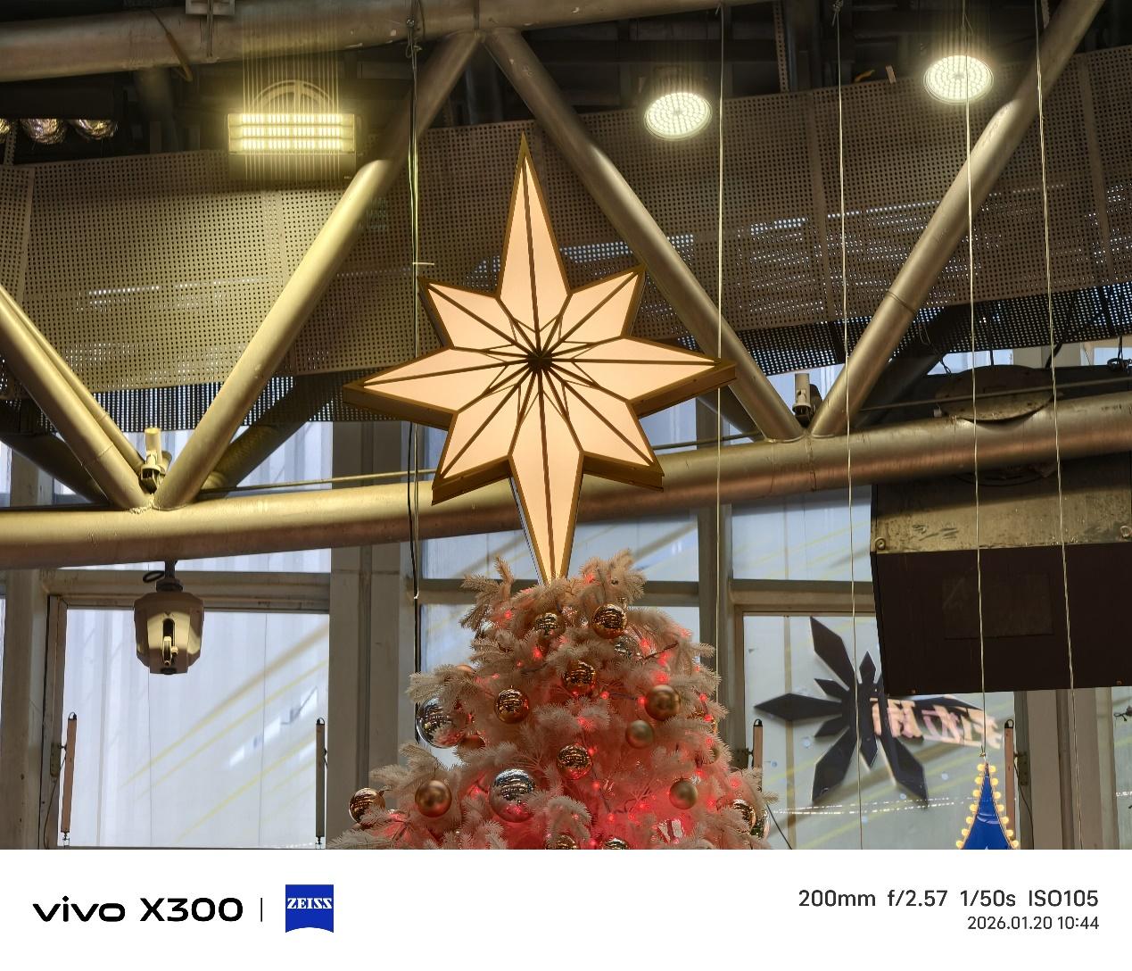 圣诞树顶部的星形装饰,线条明朗,灯光从内部透出柔和,背后金属支架的空隙也清晰分明。