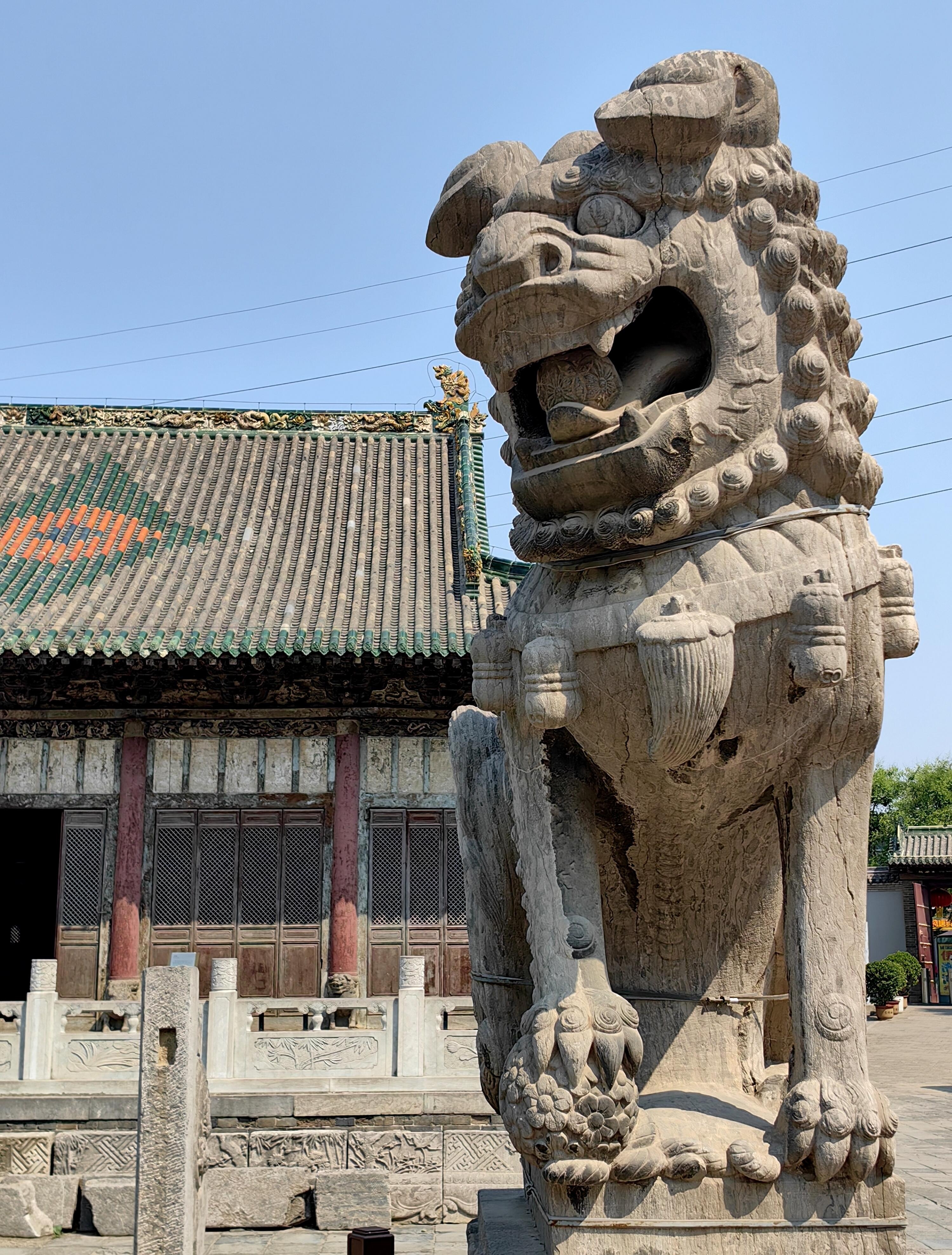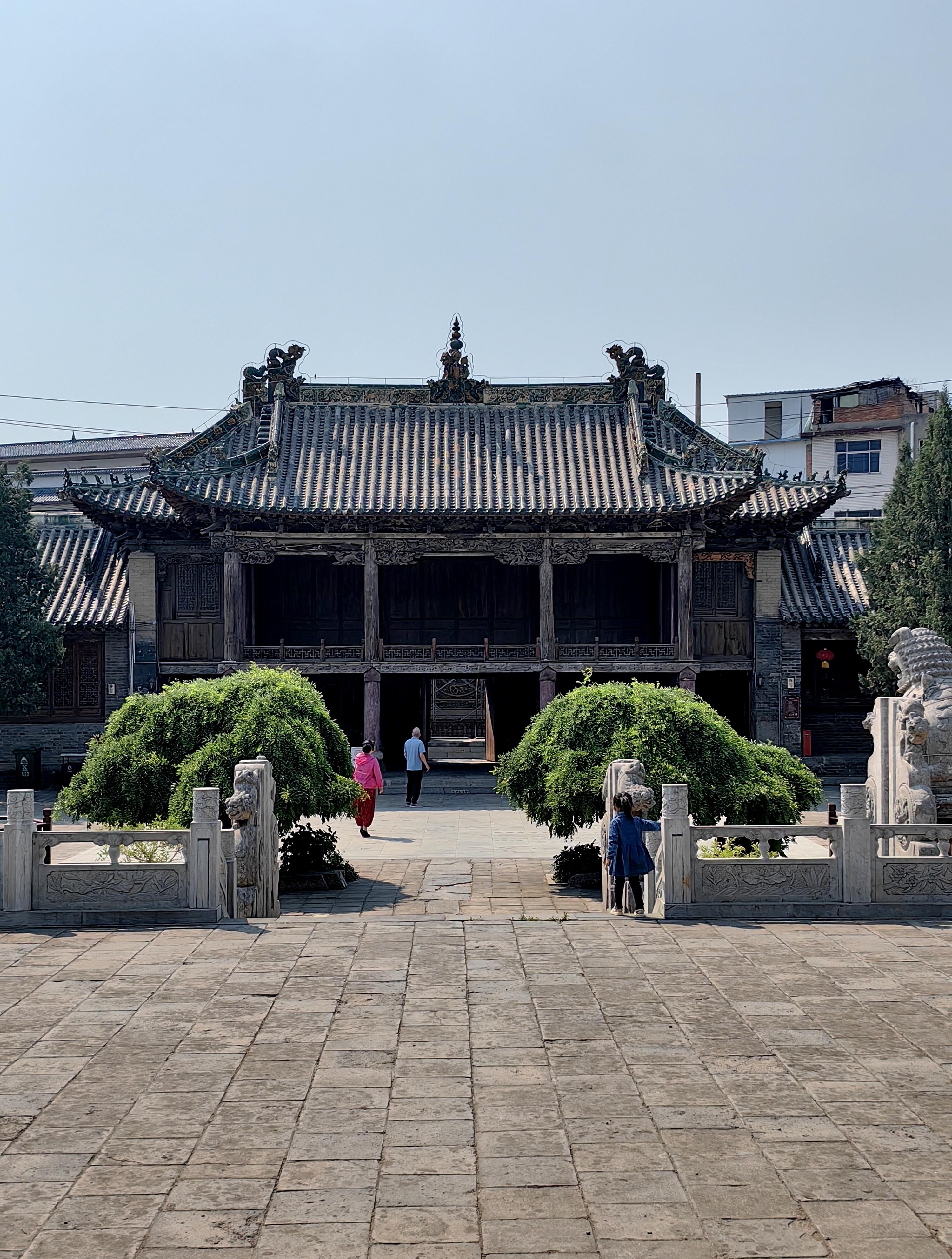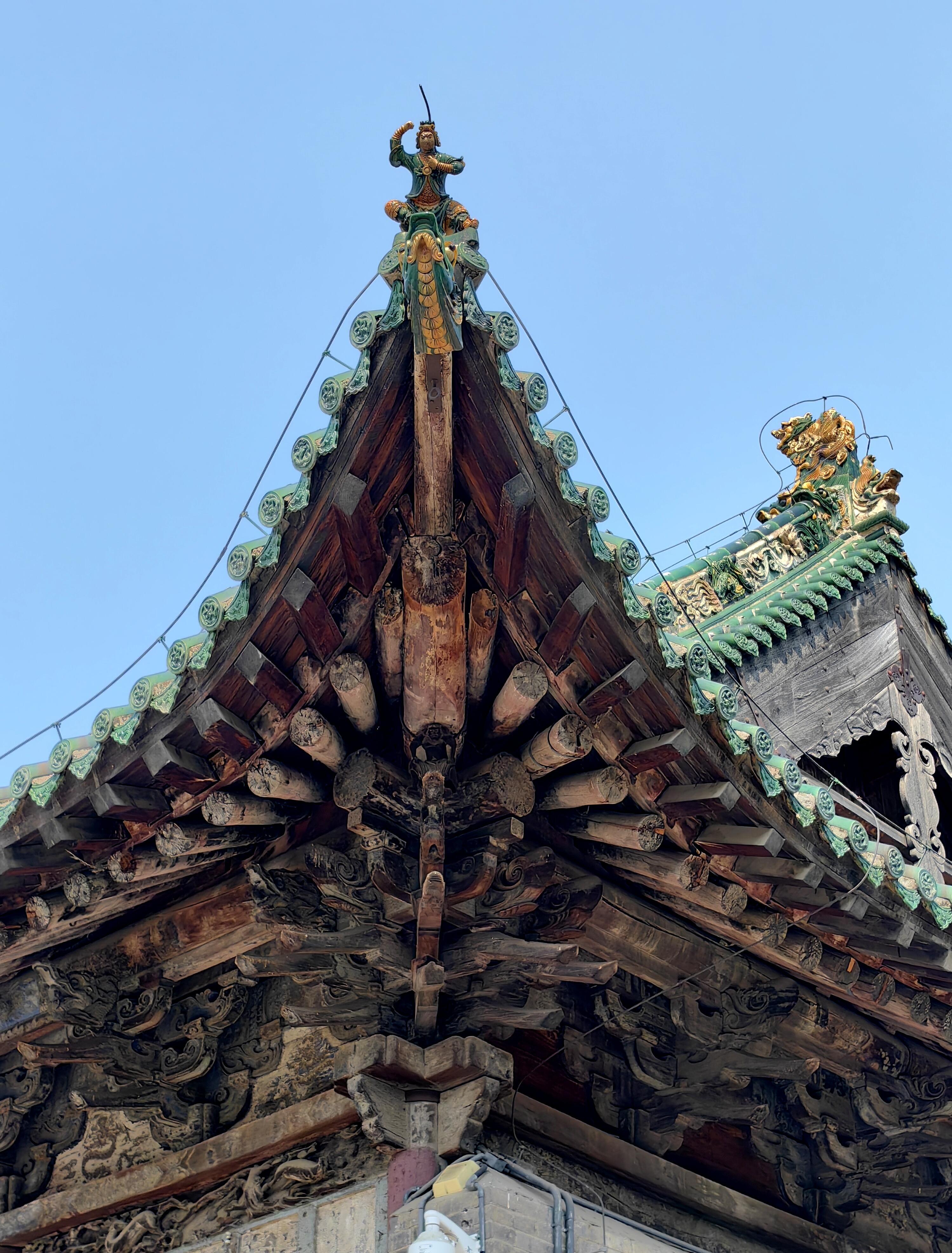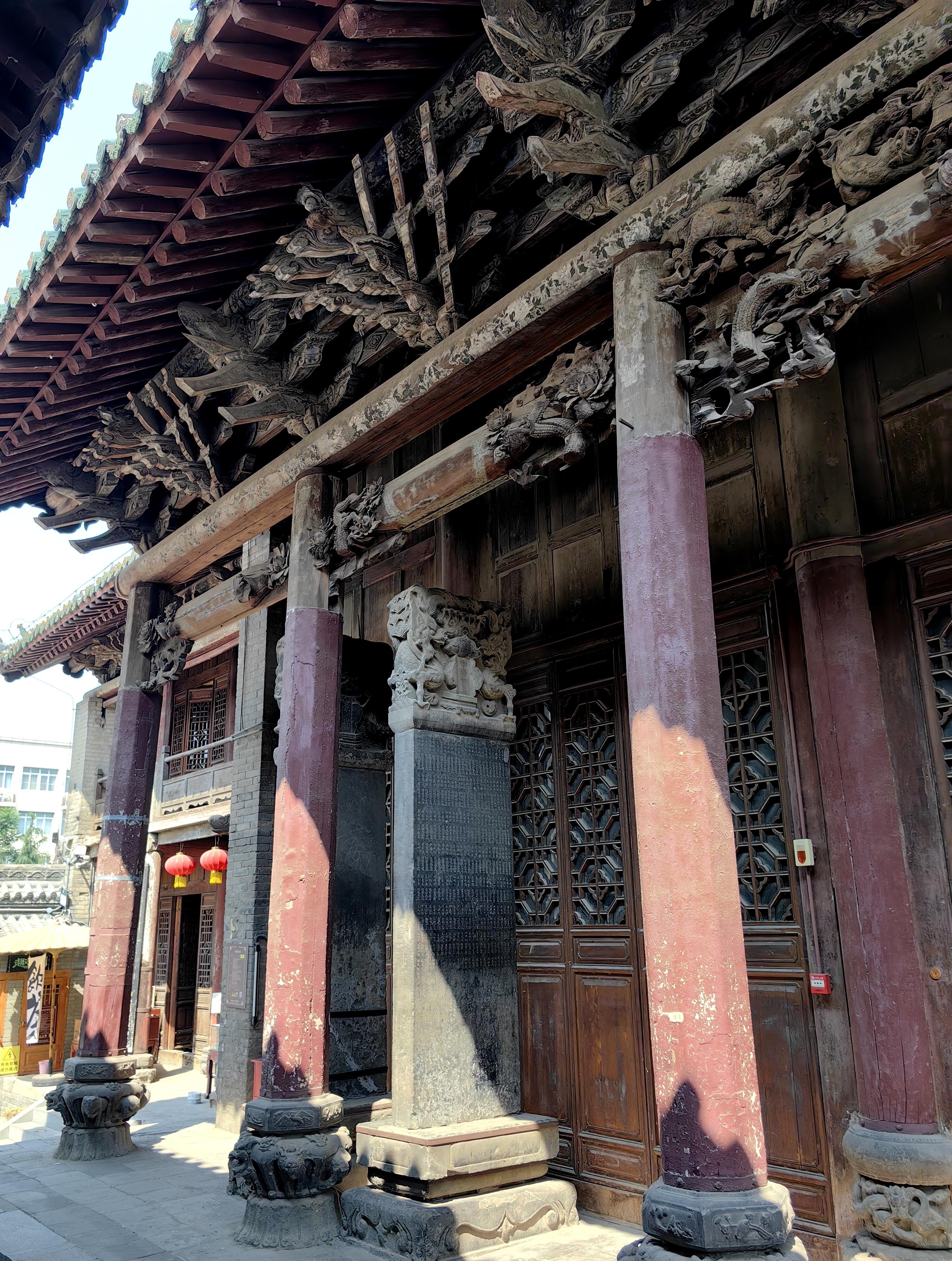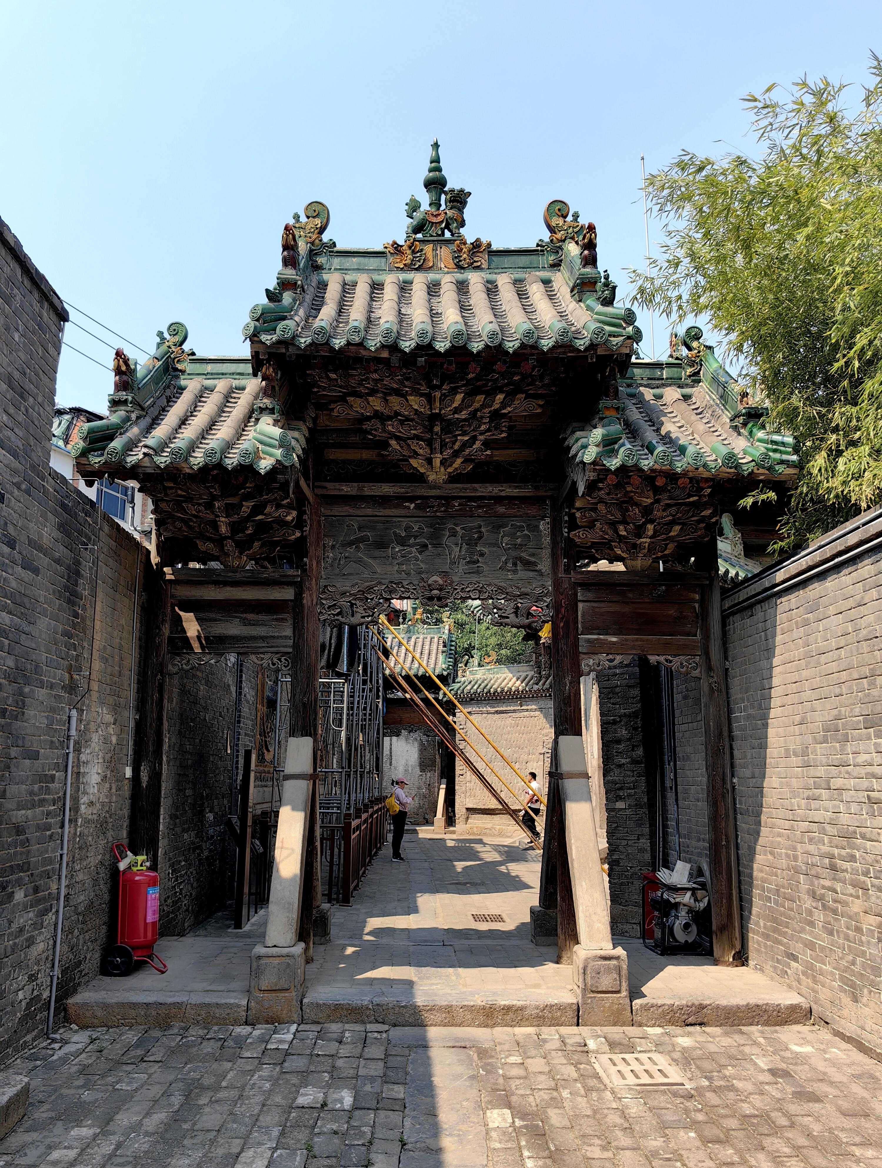 与琉璃照壁遥相呼应的山门,面阔三间,正上方“河东夫子”四个大字格外醒目。关公是河东人,被尊为“夫子”,在商人眼中,他是诚信的化身。这四个字,既是对关公的敬仰,也时刻提醒着来往的商人,经商要以诚信为本。穿过山门,后面是面阔五间的舞楼。一抬头,便能看见舞楼上精美的木雕装饰和色彩丰富的彩绘图案。木雕里的人物、花鸟栩栩如生,彩绘的线条流畅,颜色虽有些黯淡,却更添了几分古朴的味道。很难想象,在没有现代工具的年代,工匠们是如何一点点雕琢、绘制出这些精美作品的。