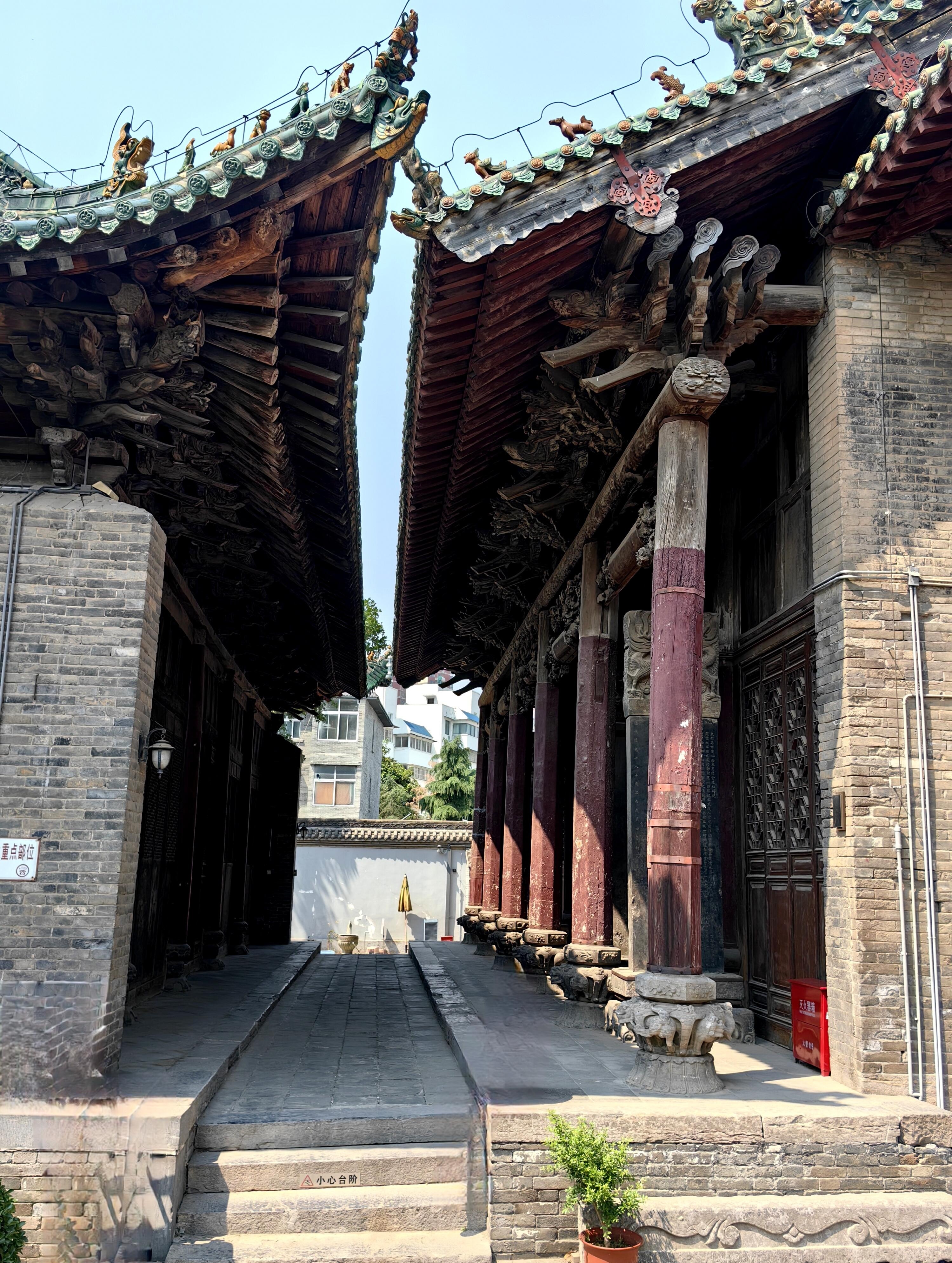 会馆坐北朝南,中轴对称的布局规整大气,只是前密后疏的设计,又多了几分层次感。沿着中轴线一路走,错落有致的建筑依次呈现眼前,仪门、琉璃照壁、山门、舞楼、拜殿、正殿,每一处都藏着故事。