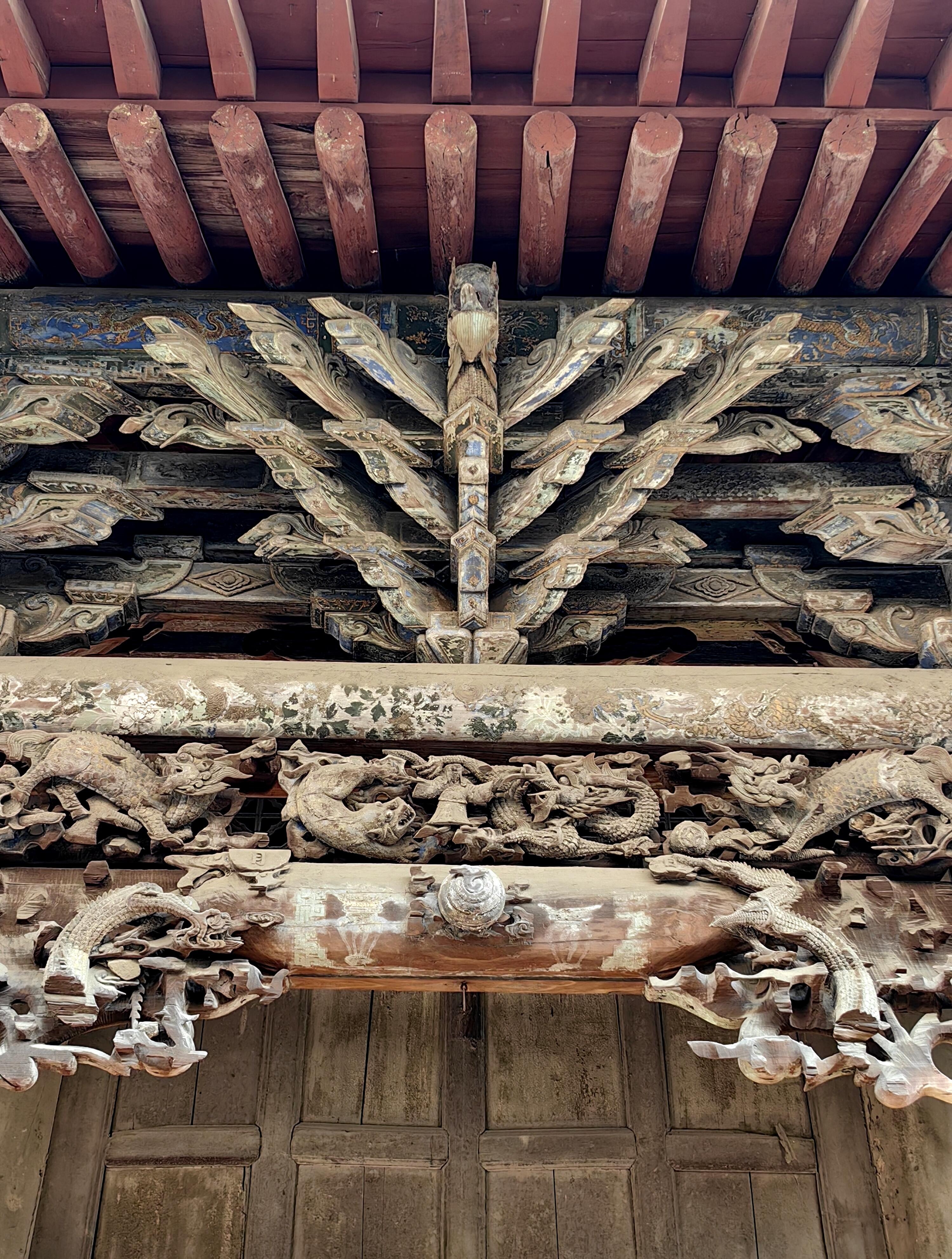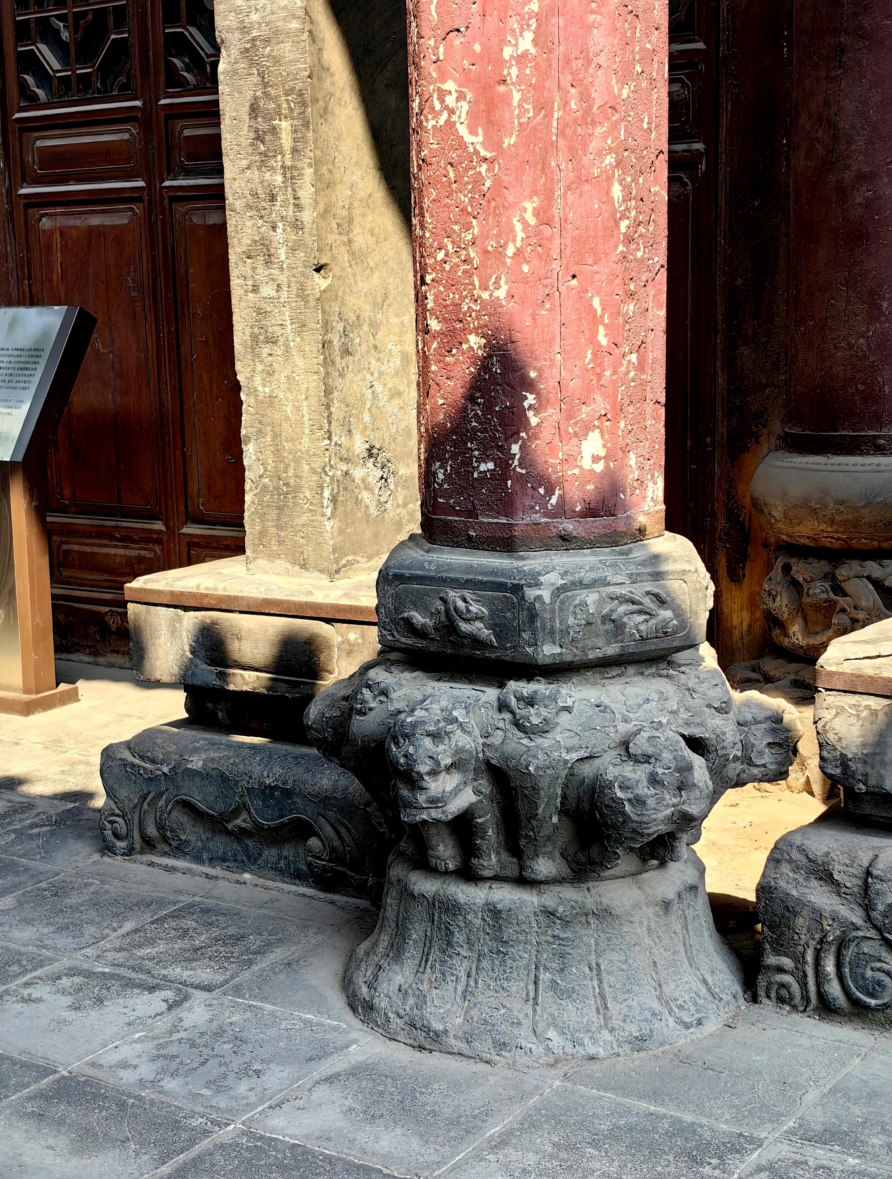 本以为拜殿的精彩已经让人惊叹,没想到后殿更是别有洞天。一到后殿,目光就被额坊和雀替上的木雕吸引。穿云龙、穿牡丹龙,龙头高昂,张牙舞爪,即便是部分破损,也挡不住雕工的精湛。那些龙身蜿蜒,鳞片细密,仿佛真的在云雾中穿梭。檐梁下的木门上,雕着人物花鸟、虫鱼细草,人物神态生动,花鸟栩栩如生,虫鱼细草也刻画得细致入微。前檐柱础更是一绝,圆雕的龙驮着莲花顶石,石上还雕着虎、牛、象等动物,莲花瓣上刻着四种字体的寿字。造型独特不说,每一处细节都做得十分精美,让人忍不住凑近了,细细端详。