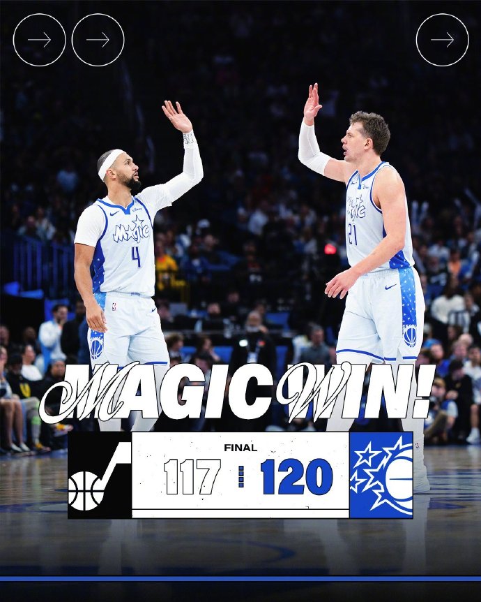 魔术今天在主场以120-117逆转险胜爵士,取得两连胜,也送给爵士两连败。魔术战绩来到27胜24负,继续排在东部第七。爵士战绩来到16胜37负,排在西部倒数第三。魔术今天最多落后17分,但下半场成功完成逆转。魔术本赛季也已经双杀爵士,不过第一次交手也是加时一分险胜,两场比赛加起来只赢了4分。