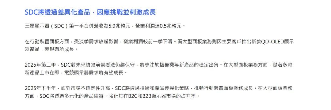 根据财报分析,三星显示(SDC)在2025年第一季度,营收降27.2%,至5.9万亿韩元;利润降44.4%,至0.5万亿韩元,应收和利润双降。