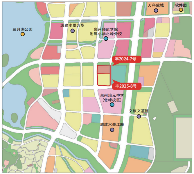 教育资源:丰2025-16号地块西北侧约400米已建设有泉州市丰泽区见龙亭实验小学,北侧约800米已建设有泉州市培元中学北峰校区。关于学区划分事宜,需待当年度片区摸底生源数,并结合新建学校投用情况后确定,具体以当年度泉州市和丰泽区的招生政策为准。