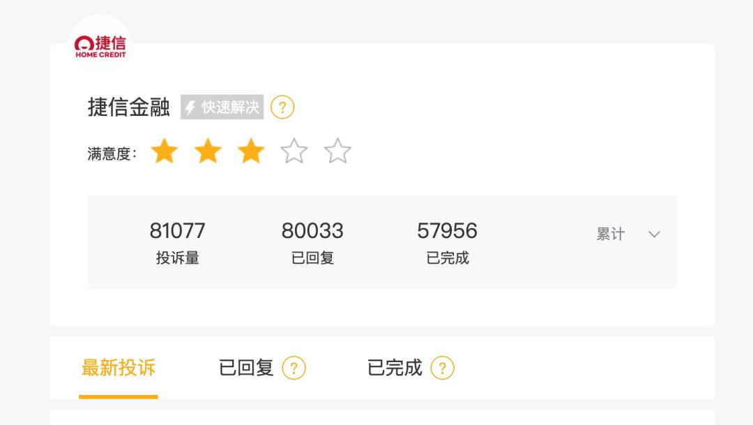黑猫投诉显示,目前仅该平台有关捷信金融的消费投诉就已经超过8万条,其中完成处理的投诉不到6万条,其中反应比较突出的问题包括高额利息、催收等,且在被京东收购之后,仍旧不断有类似的消费投诉出现。