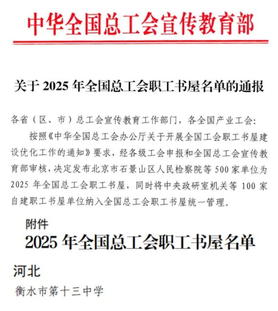 近日,全国总工会公布了2025年全国总工会职工书屋名单,衡水十三中职工书屋荣耀上榜,被授予“全国总工会职工书屋”称号。这一国家级荣誉的获得,是对该校长期以来重视教职工文化生活、积极推进书香校园建设工作的充分肯定,也是我校精神文明建设领域的又一重要硕果。