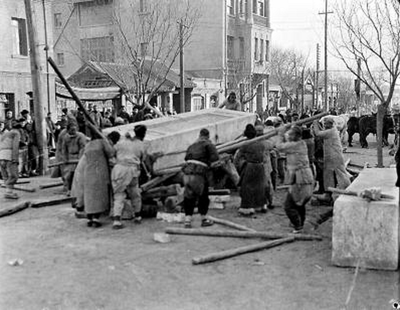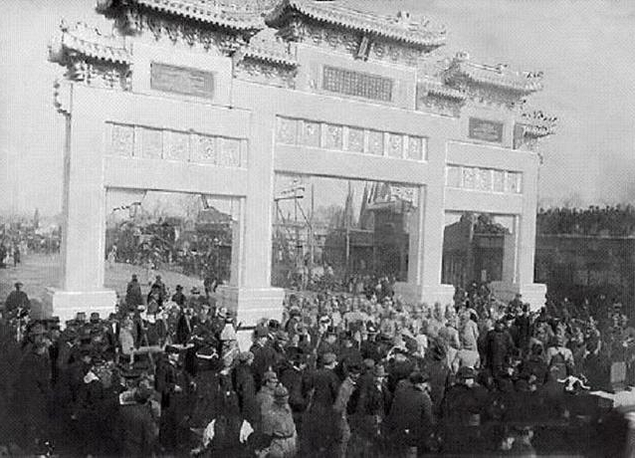 1901年的北京东单,一块大理石精雕的牌坊,在洋兵的注视下缓缓立起。