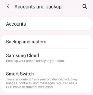 步骤 1. 首先访问三星设备上的“设置”应用程序,然后转到“帐户和备份”。