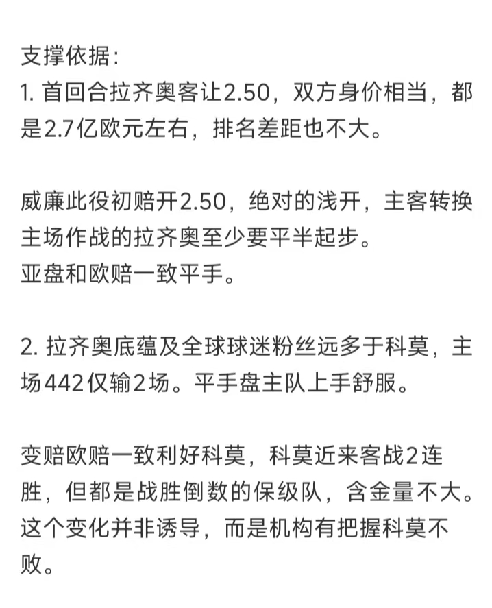 科莫的上场比赛时间在周中,他们距离本场比赛的时间只有四天,相比对手拉齐奥他们的休息时间较少,本场球队的体能可能不占优势。