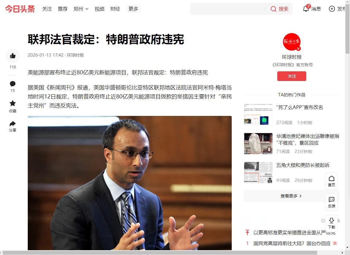 联邦法官裁定:特朗普政府违宪,2026-01-13,环球时报