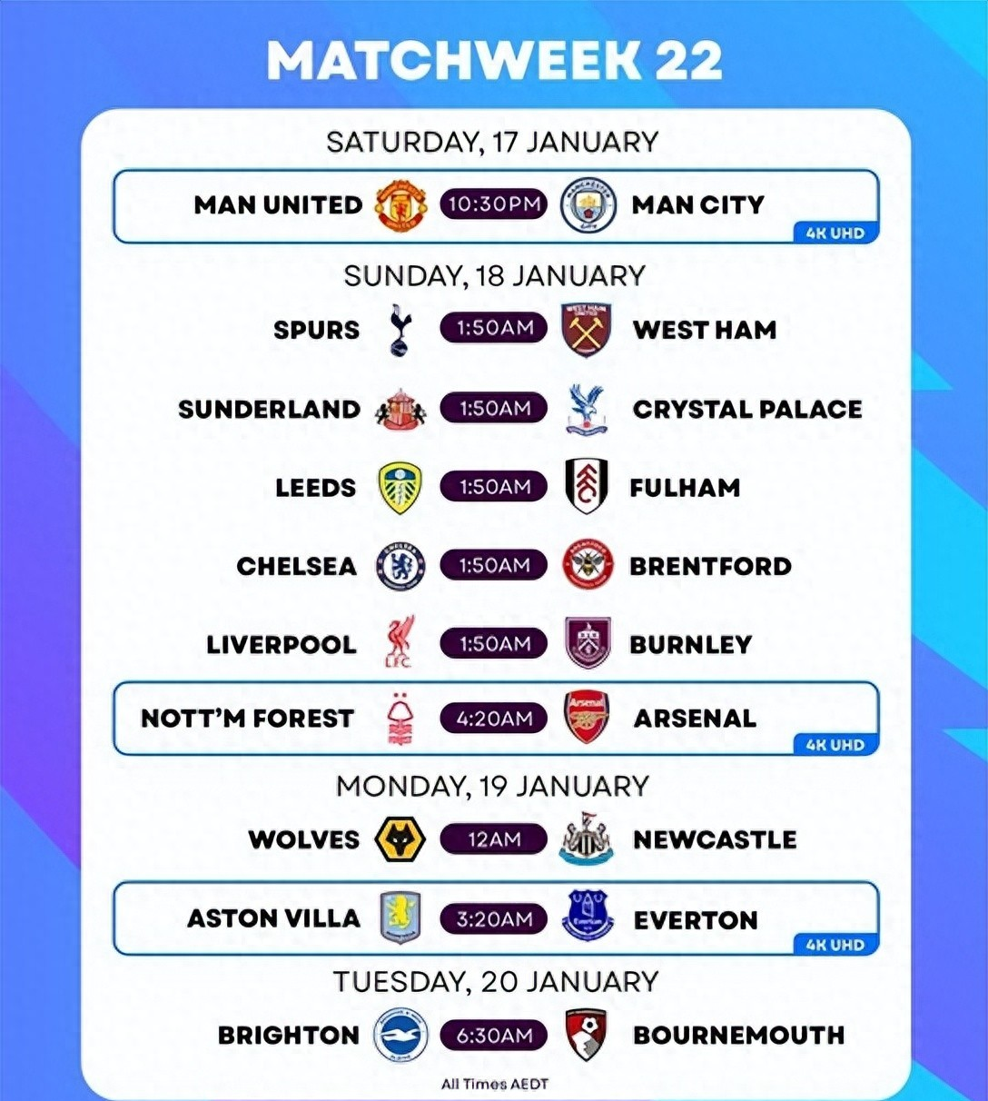 此外,本轮还会上演的有切尔西在主场对阵布伦特福德,桑德兰对战水晶宫,阿森纳客场挑战诺丁汉森林等其他值得关注的焦点对话。