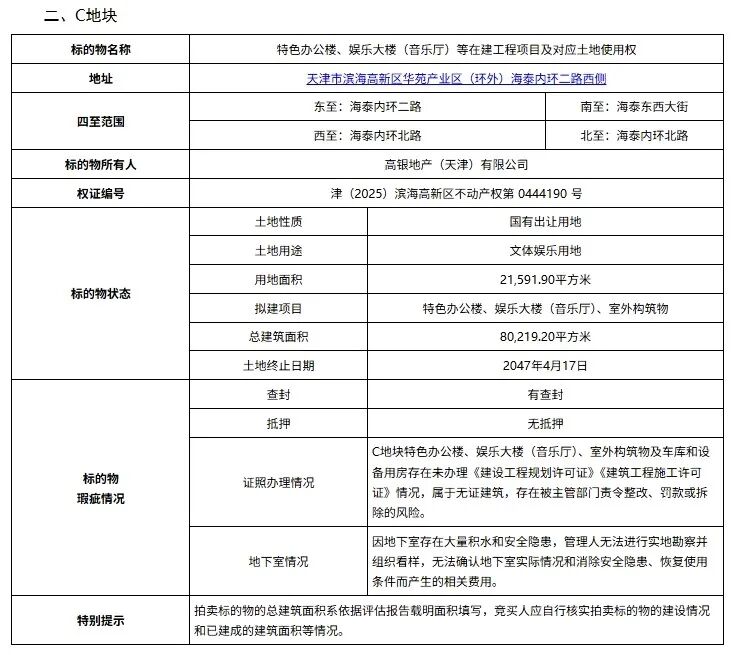 本次拍卖的资产包是一个整体,包含位于天津滨海高新区的六个地块的在建工程及对应的土地使用权。