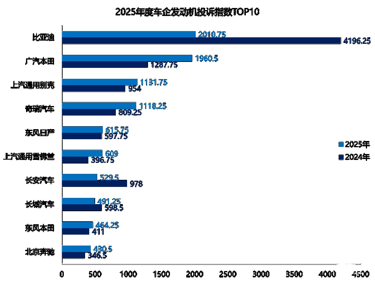 2025年,车企的发动机整体投诉指数为17298.75,同比下降16.2%。比亚迪、长安汽车等发动机投诉“大户”的投诉指数大幅下降是车企发动机整体投诉指数下滑的主要原因。东风日产、东风标致、上汽通用五菱等车企甚至跌出了榜单。从2025年度车企发动机投诉指数排行TOP10来看,比亚迪依然位居榜单第一,该车企的发动机异常启动问题依然未得到解决。此外,发动机故障灯亮、发动机异响、发动机启动困难等老问题是其他车企上榜的原因。值得一提的是,上汽通用雪佛兰和北京奔驰均因发动机故障灯亮问题,导致两家车企的发动机投诉指数均呈现不同幅度上涨,这两家车企因此成为榜单上的“新面孔”。