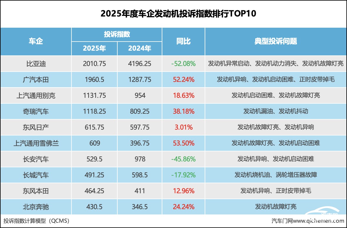 以下是2025年度车企发动机投诉指数的具体分析: