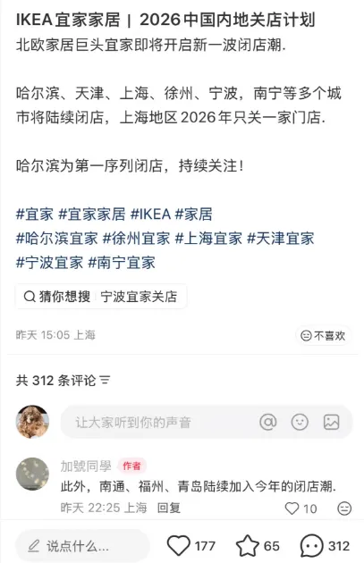 令不少福建的宜家粉感到忧心忡忡的是,关店或许还有续集。小道消息已甚嚣尘上:2026年宜家还有第二批撤店名单,福州、青岛、大连等城市在列。