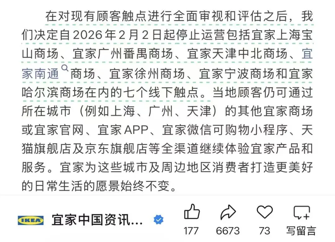 1月7日,宜家中国资讯中心发布说明称,“在对现有顾客触点进行全面审视和评估之后,决定自2026年2月2日起停止运营包括宜家上海宝山商场、宜家广州番禺商场、宜家天津中北商场、宜家南通商场、宜家徐州商场、宜家宁波商场和宜家哈尔滨商场在内的七个线下触点。”