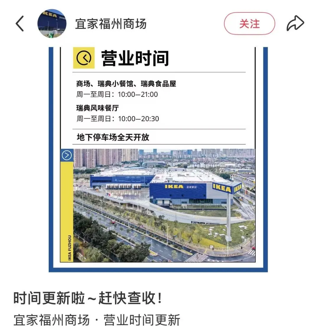 肉眼可见的变化还有:福州宜家商场的营业时长悄然压缩了。根据宜家福州商场2025年12月31日在社交平台发布的帖子,商场营业时间更新为周一至周日:10:00-21:00。
