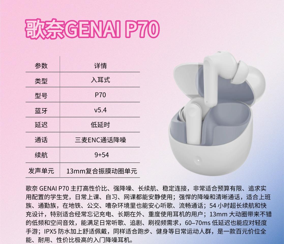 二、说了这么多,我也把自己实测过的一些入耳式蓝牙耳机分享给你们第一款、歌奈GENAI P70