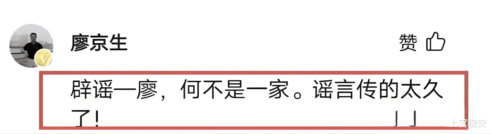 廖京生这几年也一直在辟谣,2020年他曾在一位网友写的他和何晴“爱情故事”的文章评论区留言:辟谣——廖,何不是一家,谣言传得太久了!
