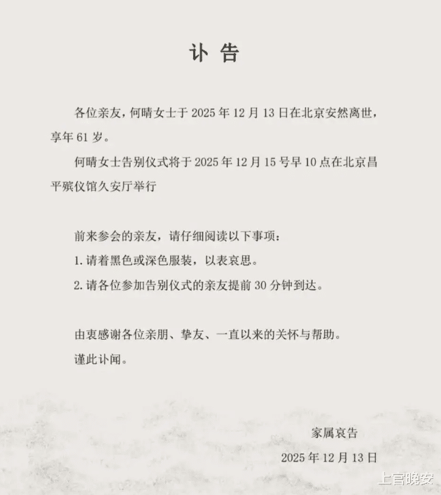 2025年12月13日,演员何晴在北京安然离世,享年61岁,告别仪式将于12月15日在北京昌平殡仪馆久安厅举行。消息来得