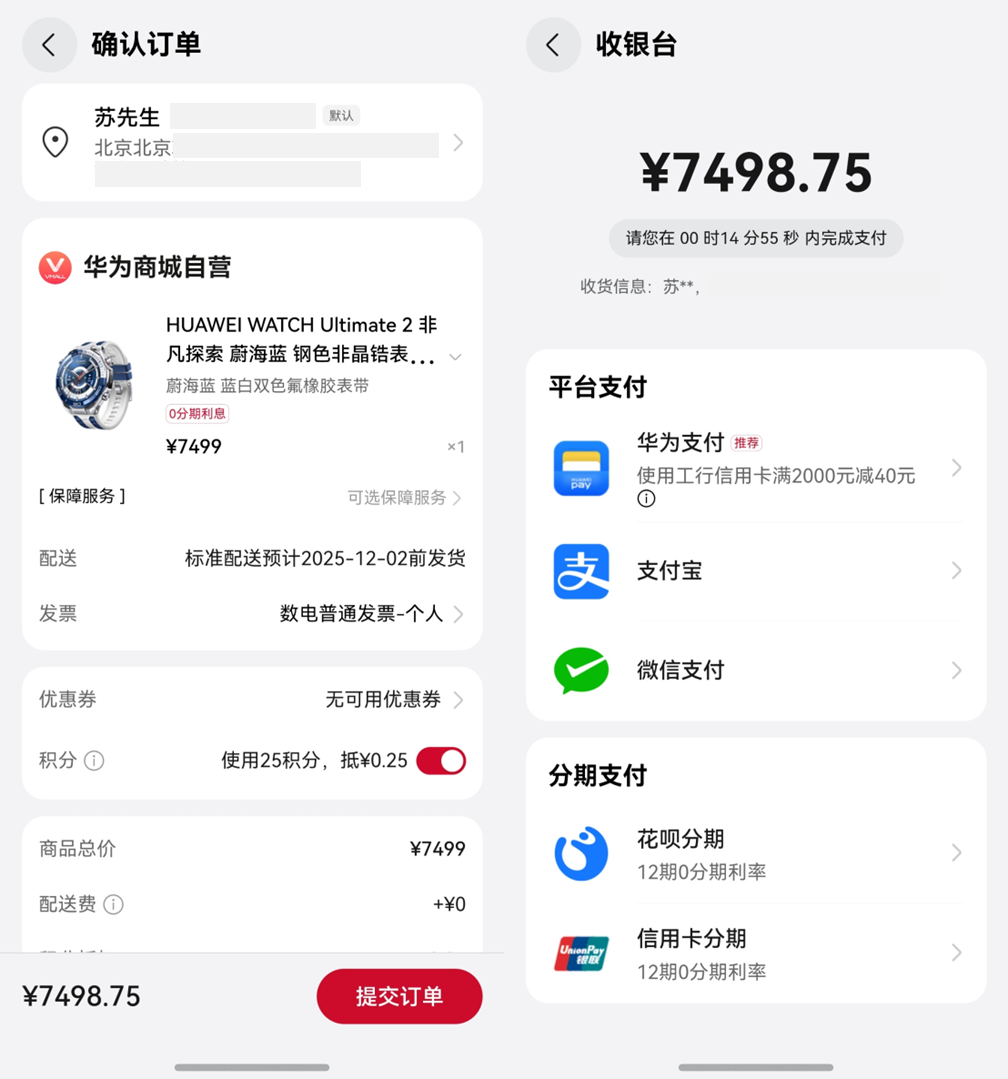 现在通过华为商城购买Huawei Watch Ultimate2,Mate80系列或MatePad Edge等新品,使用华为支付还可以享受立减的优惠,最高可省999元。同时,工商、华夏、浦发等银行还提供了专属的支付优惠,没有领券、签到等套路,直接就是满减!