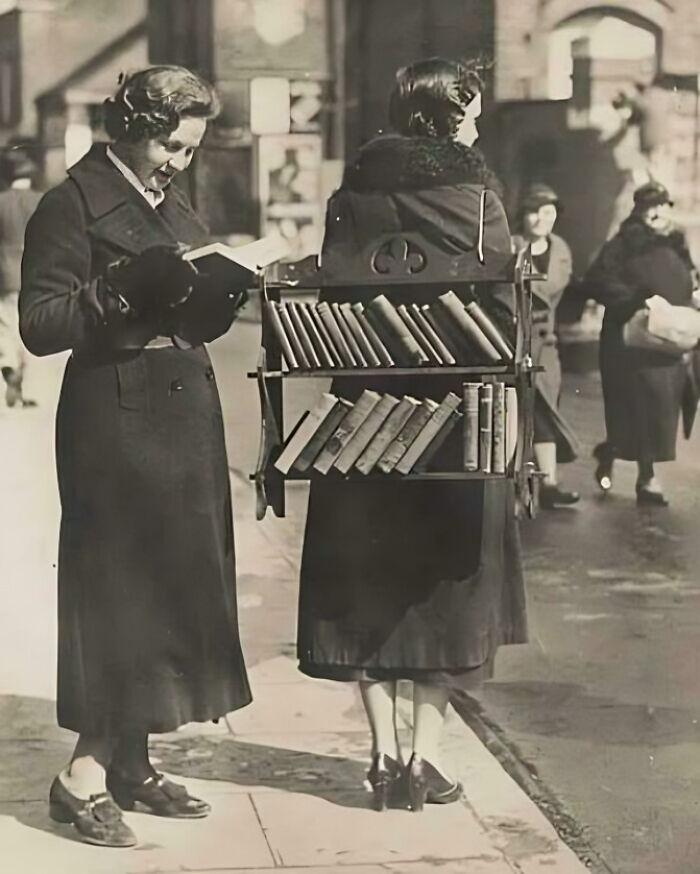 12. 一位女士通过移动的方式出租书籍,为人们提供“移动图书馆”服务。