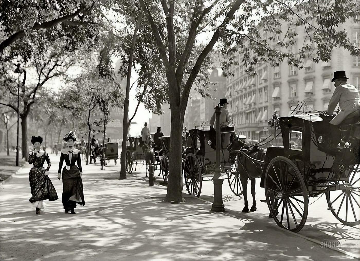 20. 1900年的纽约麦迪逊广场花园出租车司机在繁忙的街头穿梭往来,为市民提供便捷的交通服务。