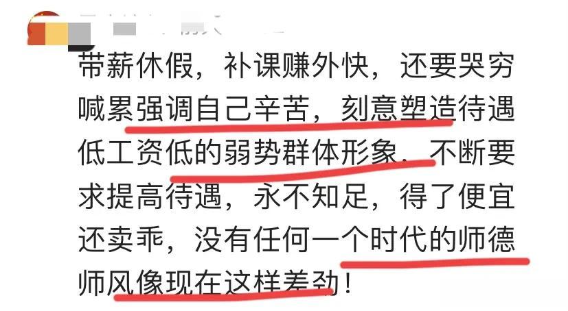 许多家长认为,老师带薪休假,补课赚外快,还要哭穷喊累强调自己辛苦,没有任何一个时代的师德师风像现在这样差劲!