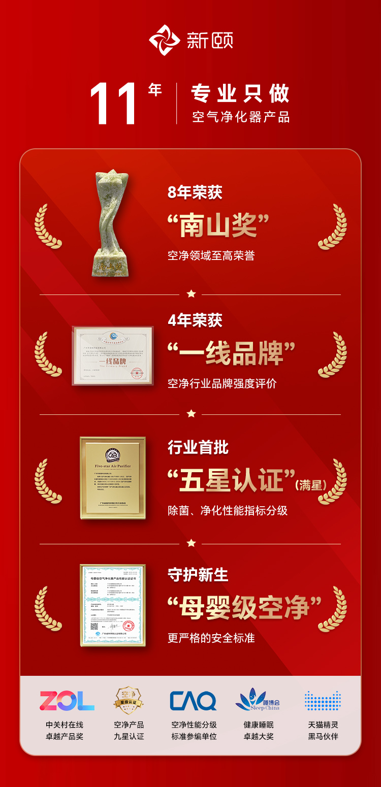 说到专业,就不得不提背后的品牌。新颐,一个连续11年只专注于空气净化领域的品牌。这份专注,也换来了行业的深度认可:连续4年荣获行业“一线品牌”、品牌强度稳居全国前十,更值得一提的是,它是行业内唯一8次获得钟南山院士亲自命名并颁发“南山奖”的品牌。能够参与制定超过7项行业标准,并成为华为、天猫精灵的生态伙伴,其产品力与创新力可见一斑。