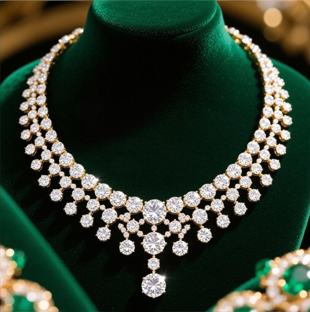 3. 材质奢华沙特王室钻石项链所选用的材质均为品质。无论是钻石、红宝石还是蓝宝石等宝石,都色泽鲜艳、纯净无瑕。这些宝石经过精心搭配和镶嵌,使得每一件项链都闪耀着璀璨的光芒。