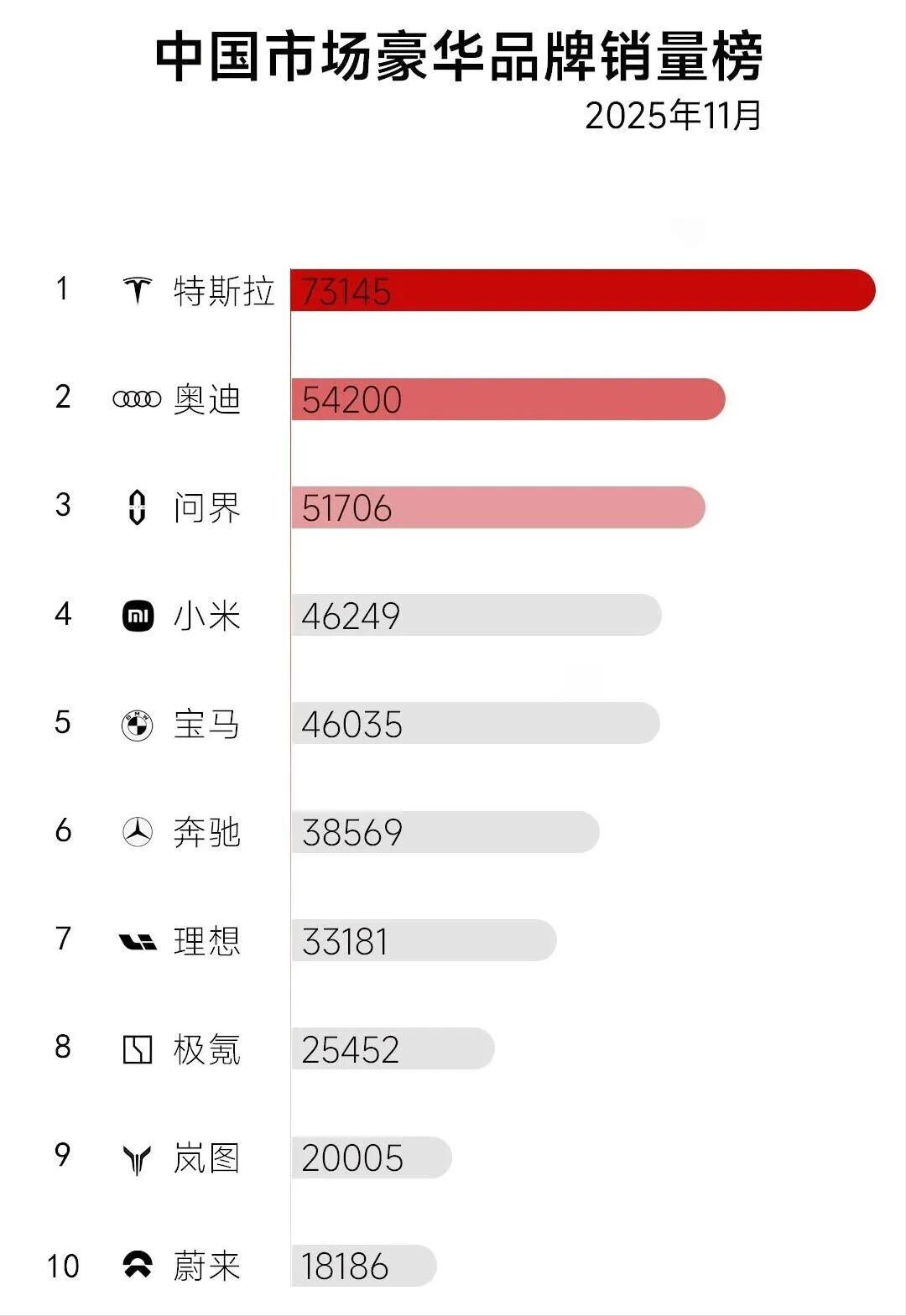 先上一个2025年11月份,中国豪车销量排行榜,大家就会一目了然的。