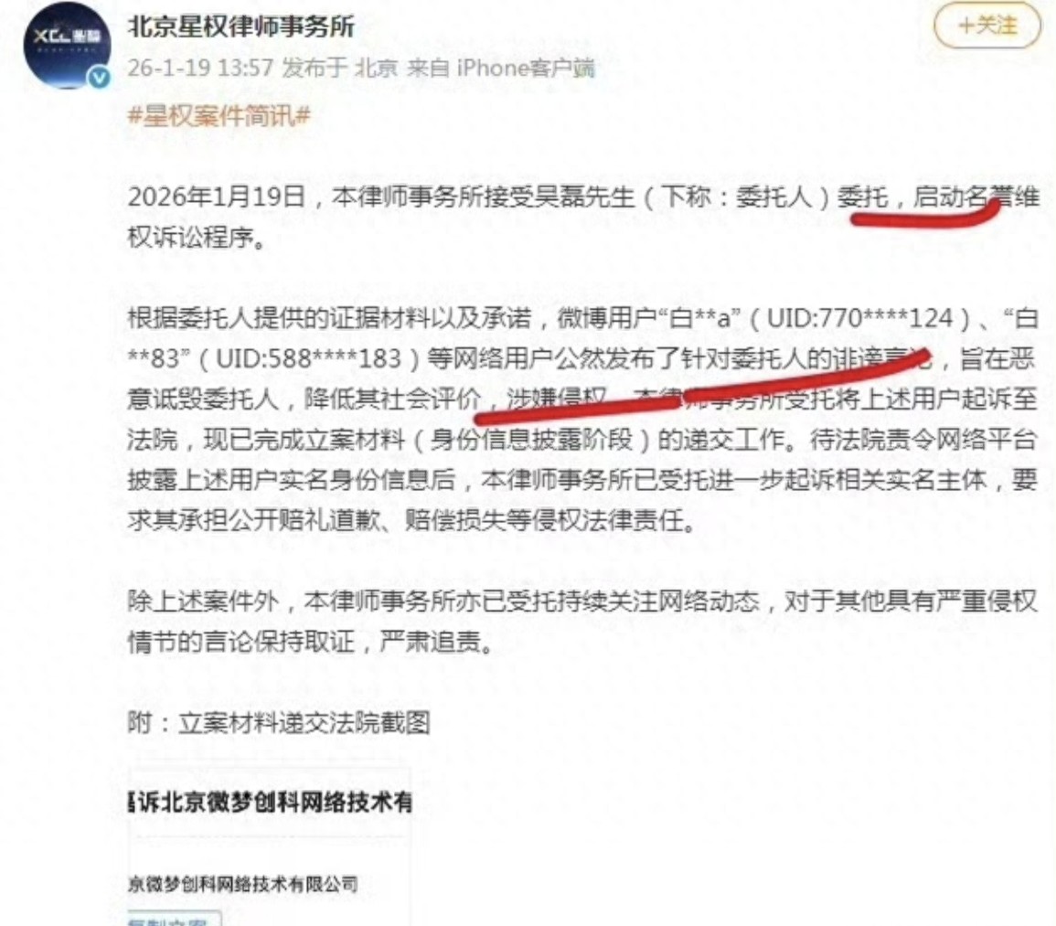 面对突袭,吴磊团队直接开启“加速挂”。19:37爆料出现,20:45工作室声明就位,68分钟完成取证+公证+律师函,效率堪比“外卖闪送”。声明硬核三连:不认识、全造谣、已立案。随后北京星权律所晒出法院回执,直接把“白珊珊a”及小号“白珊珊83”一起告上法庭,要求公开道歉+赔偿损失,一条龙维权安排得明明白白。