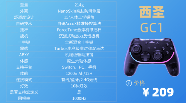在功能体验上,这款西圣GC1同样堪称“满配水准”。电竞级0.5ms极速连接引擎让输入响应几乎做到“所想即所控”,2.4G、蓝牙与Type-C三模连接在稳定性与兼容性上全面拉满,手机、电脑、Switch都能即连即玩。原生六轴体感系统实现1ms级动作捕捉,在射击瞄准、赛车甩尾等场景里动作映射更跟手、更精准。手感方面采用214g轻量化机身、15°人体工学握角与NanoSkin亲肤防滑涂层,长时间开黑也能保持稳定舒适的握持状态。外观上配备半透明幻雾晶透机身与10种RGB 灯效模式,科技感和沉浸感直接拉满。一机兼容全平台,再加上这份越级的硬件堆料,我敢说,在百元价位里,很少能找到能打得过它的电竞手柄,是今年最值得入手的高性价比选择之一。