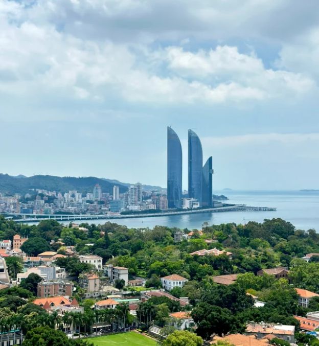 继续上行约五分钟,可抵达由条石垒砌的龙头山寨寨门遗迹。石门高度约两米,两侧石墙残留部分垛口,门楣上方横梁刻有“龙头山”三字。穿过寨门后坡度变陡,需借助铁链扶手攀爬最后一段台阶。顶峰平台面积约二十平方米,中央立有一根高约六米的圆台形石柱,柱顶设有小型测风仪。站在平台上环顾四周,厦门本岛的高楼轮廓、鼓浪屿错落的红砖屋顶以及鹭江航行的船只均清晰可见。