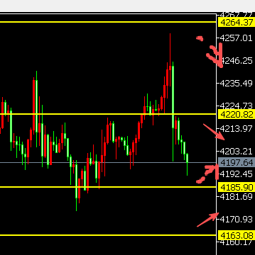 昨天的走势上面,黄金弹起,一路冲高,加速至4260后。突然反手跳水,直线下跌,最低跌至4190附近,跌幅达到了70美金,重回4200震荡调整。