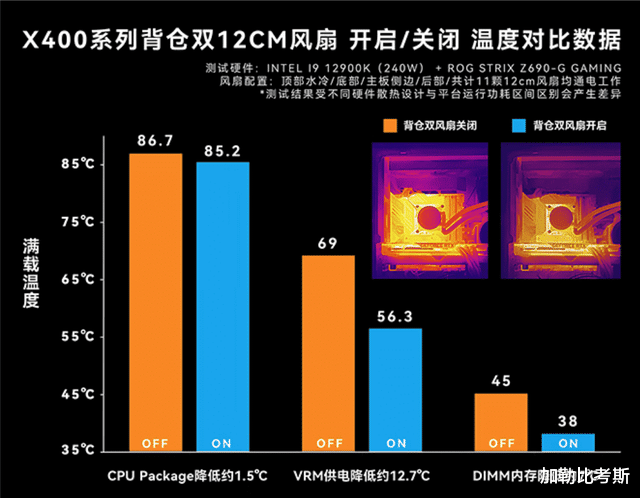 值得一提的是,X400搭载了专有的主板辅助导风散热系统,允许玩家在背仓自行加装双12cm 风扇,将冷气流精准导向主板仓。这一设计能显著增强主板MOSFET供电元件、内存及CPU的散热表现,大幅提升高功率硬件在高负载下的工作稳定性。根据官方实测数据,开启该系统后,VRM供电温度可降低约12.7°C,内存温度也能降低约7°C,这对于追求极限稳压的超频玩家或长时间渲染的创作者来说,无疑是极具实用价值的“散热补丁”。附官方测试数据: