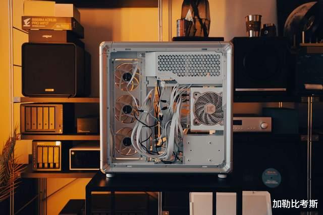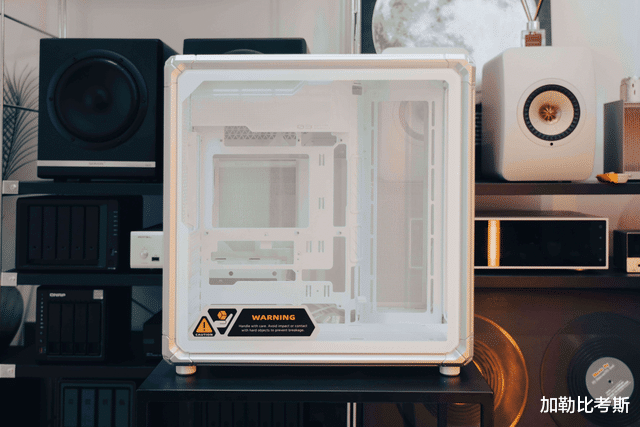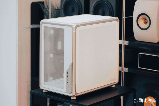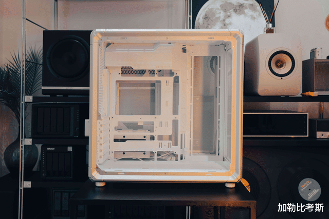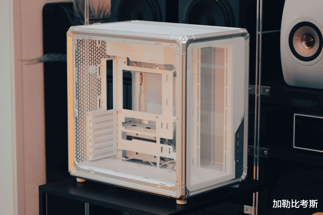 先来看侧面,乔思伯X400干练的银白色全铝颜色的框架,配合通透感十足的高透玻璃,让内部顶级的纯白硬件一览无余。这种极致的银白质感在冷色灯效的映衬下,不仅消解了电子产品的厚重感,更让整机宛如一座精致的雪山冰雕,放在书房里就像是一件纯粹的工业艺术品。