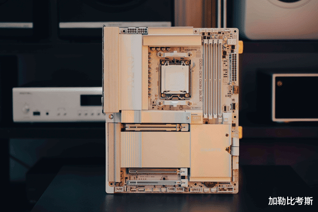高性能往往伴随高发热,技嘉为此准备了豪华的散热全家桶。主板背部配备了PCB散热背板,官方称散热性能提升了14%,显著增强了主板的结构强度与稳定性。正面则拥有堆叠式M.2散热装甲和一体化VRM散热模块,确保主控和供电在长时间运行下依然保持凉爽,甚至还贴心地加入了“大力士背板”以承重日益沉重的旗舰级显卡。