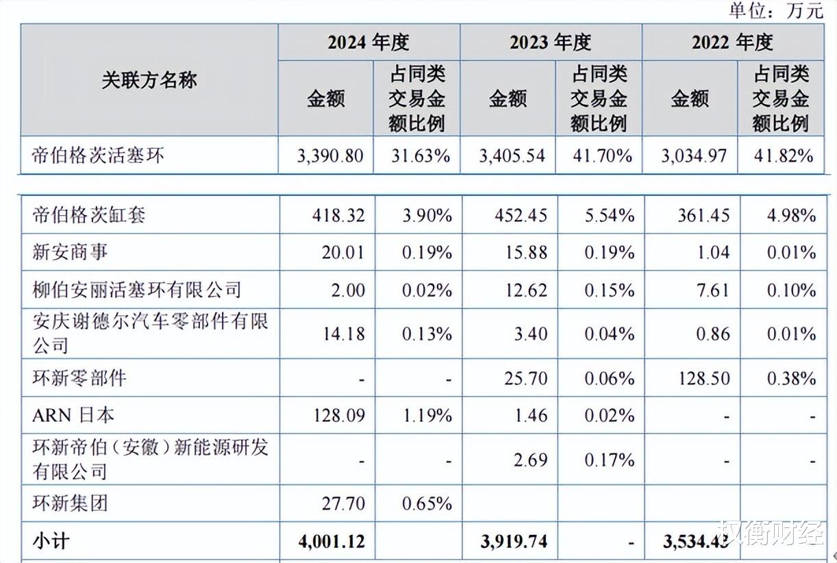 新富科技向帝伯冶金采购的内容主要为电力采购,主要系新富科技厂房与帝伯冶金厂房位置相近,供电公司在相关区域厂房建设初期仅设立一座变压器供位置相近公司共同使用。2022年-2024年,公司关联采购金额合计分别为1106.99万元、1288.28万元和3824.48万元。安庆市生态环境局2023年3季度“双随机”抽查结果中发现帝伯格茨活塞环存在环境违法行为。