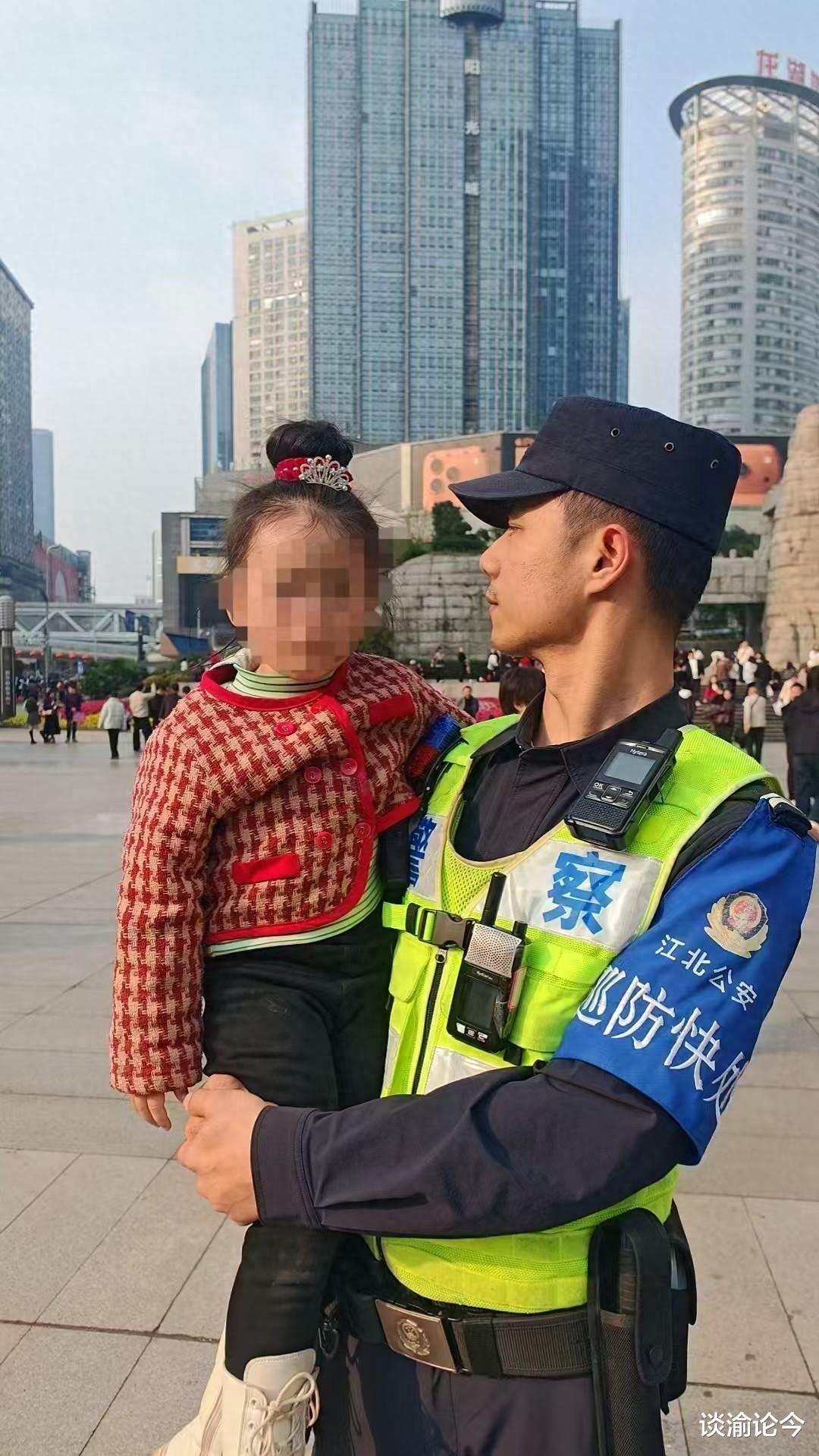 围观群众越聚越多,小女孩小小的身影在人群中显得格外无助,哭得越发厉害了。人们议论纷纷间,观音桥商圈巡防快处大队的队员巡逻到此,发现了哭泣的小女孩。
