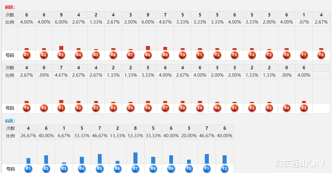 奇偶失衡,近50期前区奇偶比以3:2为主流(占比50%),全奇组合实属罕见。