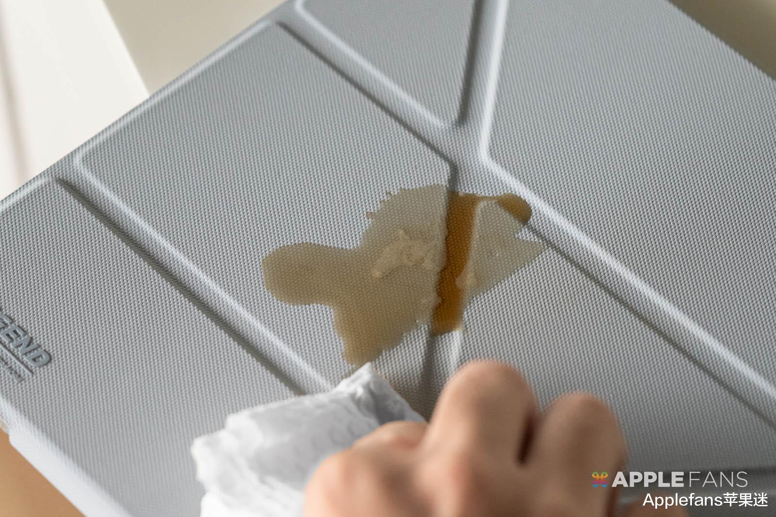 表面都是采用防泼水的材质,像是遇到桌上的水渍、手上的汗水,只要快速地把它擦拭掉,就不用担心污渍会残留在iPad 保护壳上。