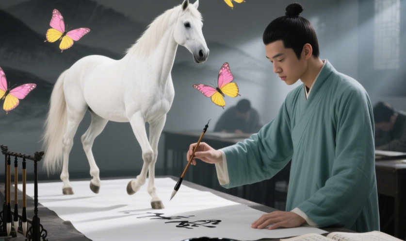 “踏花归去马蹄香”一题难倒众人。胜者不画满地落花,只绘几只蝴蝶萦绕马蹄——以视觉通感,绝妙诠释无形香气。