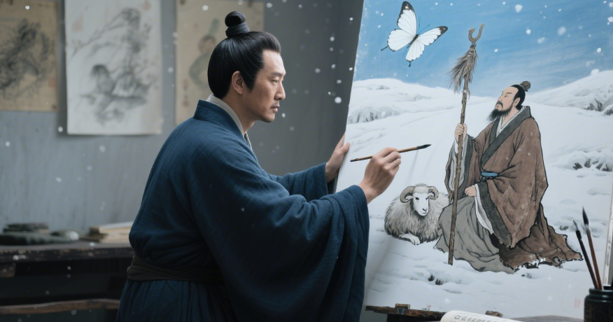 宋徽宗御笔朱砂一圈,这位科场败将终登画院魁首。王道亨以苏武牧羊图演绎“蝴蝶梦中家万里”,将游子愁思化作冰天雪地中一只翩跹蝶影,同样叩开了艺术殿堂。