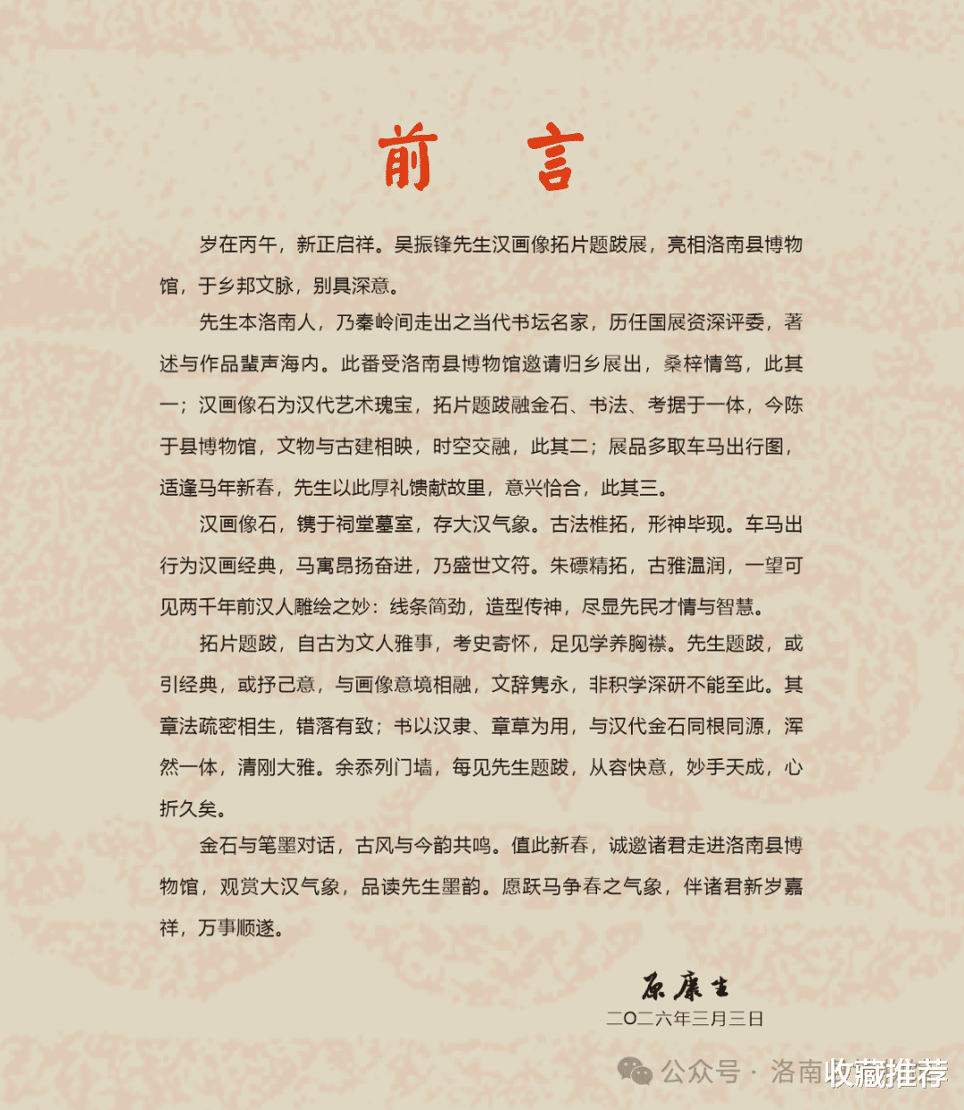 岁在丙午,新正启祥。为传承中华优秀传统文化,丰富群众精神文化生活,“跃马争春——吴振锋汉画像石拓片题跋展”在汉字故里——洛南县博物馆隆重开展。这场跨越两千年的金石雅集,由乡贤名家吴振锋先生倾情呈现,共展出精品力作20幅,以古拓为媒、以笔墨为韵,为洛南献上一场文气充盈的艺术盛宴。