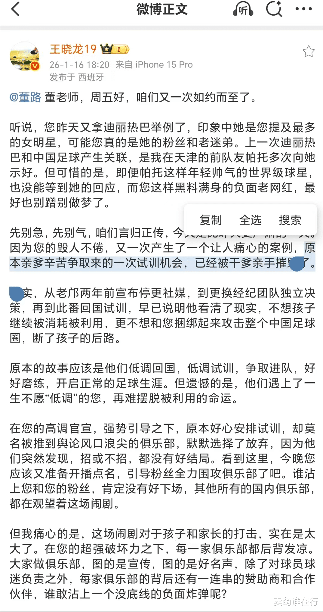 而一个不在一线队考虑范围内的试训球员,却被舆论包装成即将登陆中超,最终受到舆论裹挟,导致试训被叫停,毫无疑问这场闹剧对于孩子和家长造成了不小的打击。